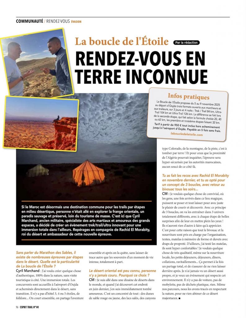 Le magazine Esprit Trail consacre un bel article à La Boucle de l’Étoile dans son numéro 141, mettant en avant l’esprit unique de cette aventure au cœur du désert oriental marocain.
